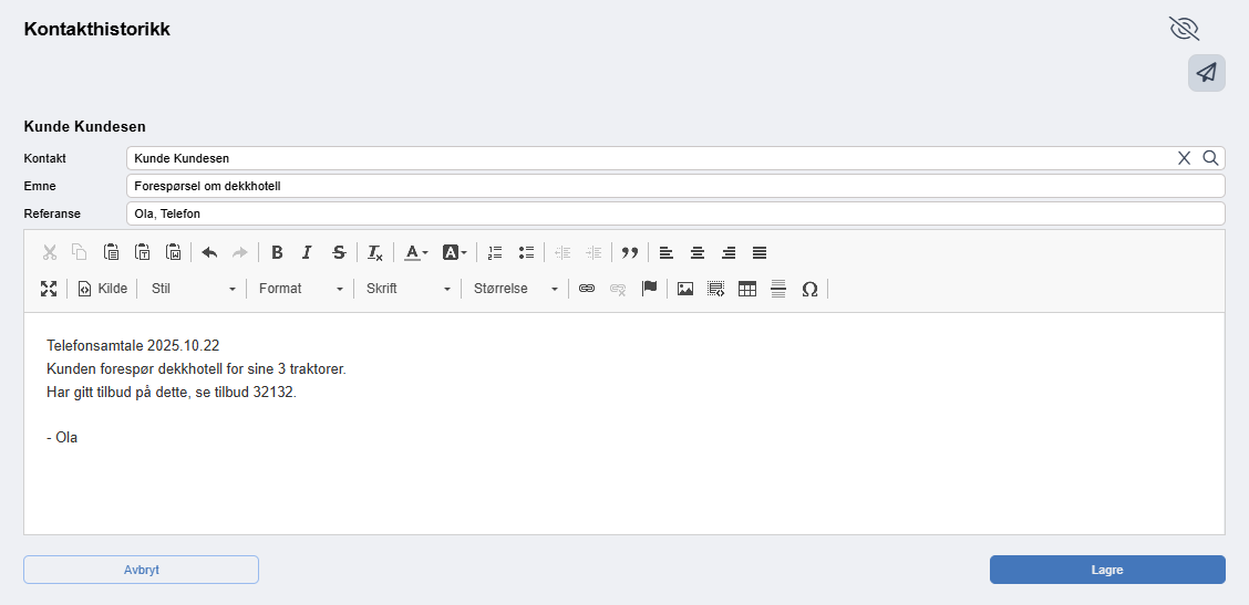Når du klikker på "lagre" lagres denne kommunikasjonen som en egen post under Kontakthistorikk som alle ansatte kan åpne og lese. Du kan også velge å sende hele innslaget som en e-post via papirflyet øverst i høyre hjørne.