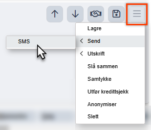 - Hamburgermenyen viser alternativer/handlinger man kan utføre på en kunde utover de man allerede har knapper for, som f.eks. Samtykke og Kredittsjekk.
