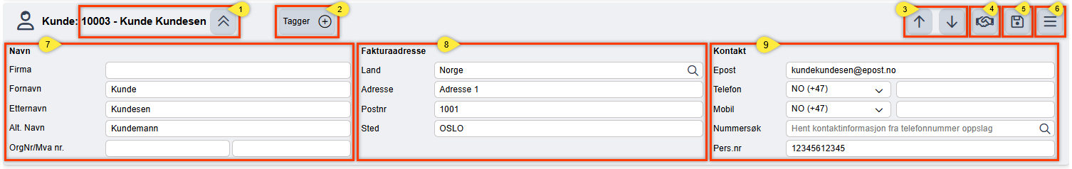 - Kundenummer, kundenavn, og knappen for å skjule/vise personalia.
