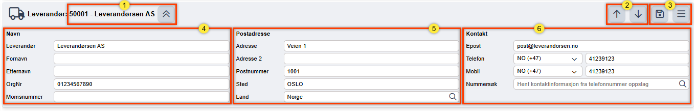 Headeren på leverandørkortet er delt inn i forskjellige seksjoner (klikk på bildet for å gjøre det større):