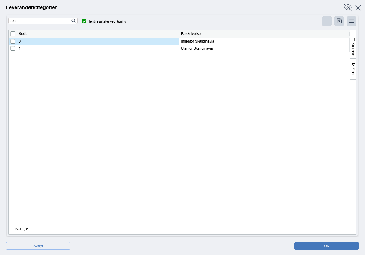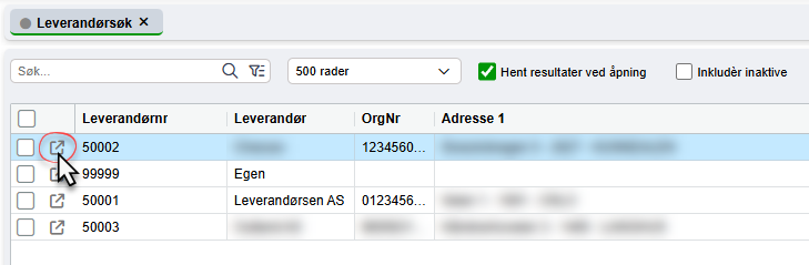Man kan åpne et leverandørkort ved å åpne et leverandørsøk (⌨️Alt+L), søke opp leverandøren, og trykke på åpneknappen på leverandørens rad i tabellen.