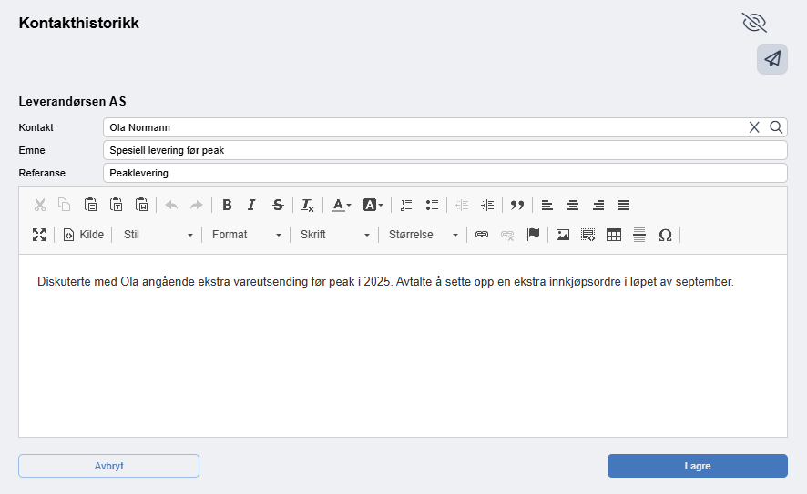 Når du klikker på "lagre" lagres denne kommunikasjonen som en egen post under Kontakthistorikk som alle ansatte kan åpne og lese. Du kan også velge å sende hele innslaget som en e-post via papirflyet øverst i høyre hjørne.