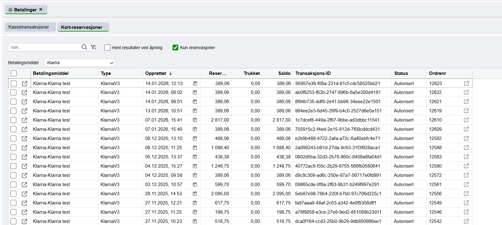 Alle kort-reservasjoner vil være registrert under Hovedmeny -> Betalinger -> Kort-reservasjoner.
