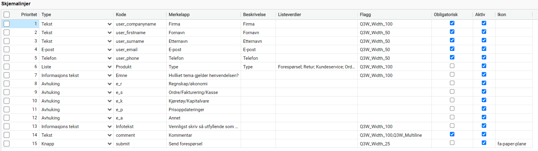 Flagg: Her kan du for eksempel legge til et flagg som sier hvor bred skjemalinjen skal være (100 hvis den skal fylle hele skjemaet, 50 hvis den bare skal fylle halvparten slik at det blir plass til to felter ved siden av hverandre). Skjemalinjen er på 50% som standard på web. Denne kolonnen er relevant for utseende på web.