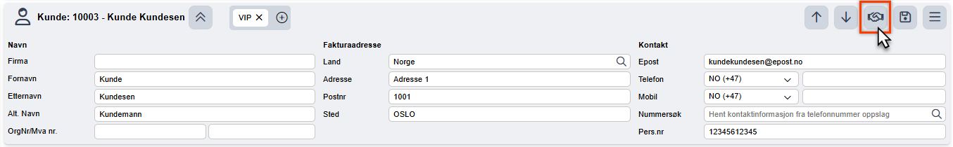Kjøper legges inn som kunde. Hvis veiviseren ble aktivert fra kundekortet vil kunden automatisk være fylt ut, men kunde kan selvfølgelig endres hvis ønskelig. Redigering av kontaktinformasjon må gjøres på kundekortet. - Innbytte