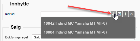 Hvis det skal taes et individ i innbytte legges det til her. Individet må være opprettet på kunden på forhånd, og det er kun individer som eies av denne kunden som kan legges til. Mangler individet så må dette legges til på kundekortet under fanen "Individer". Her er det viktig at innbytteindividet har status "Brukt".
