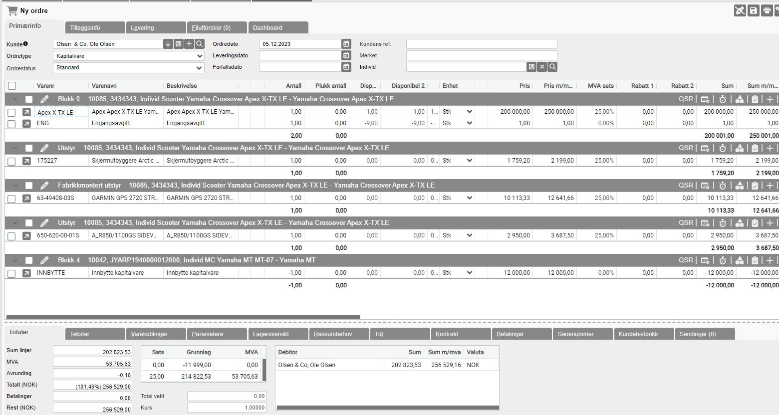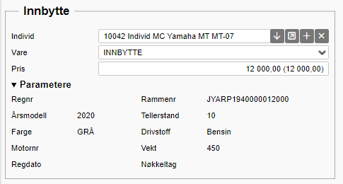 Innbytteprisen legges inn manuelt som plussbeløp. Antall blir automatisk -1 på ordren. Parametre kan vises og skjules ved behov. Disse må fylles ut og redigeres fra individkortet. - Salg