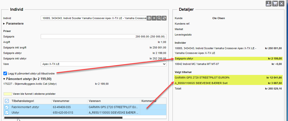 Inne på individet under fanen "Påmontert utstyr" kan man enkelt holde oversikt over alt utstyr som følger individet ved salg. Dette er utstyr som er priset i tillegg til salgsprisen på selve individet.