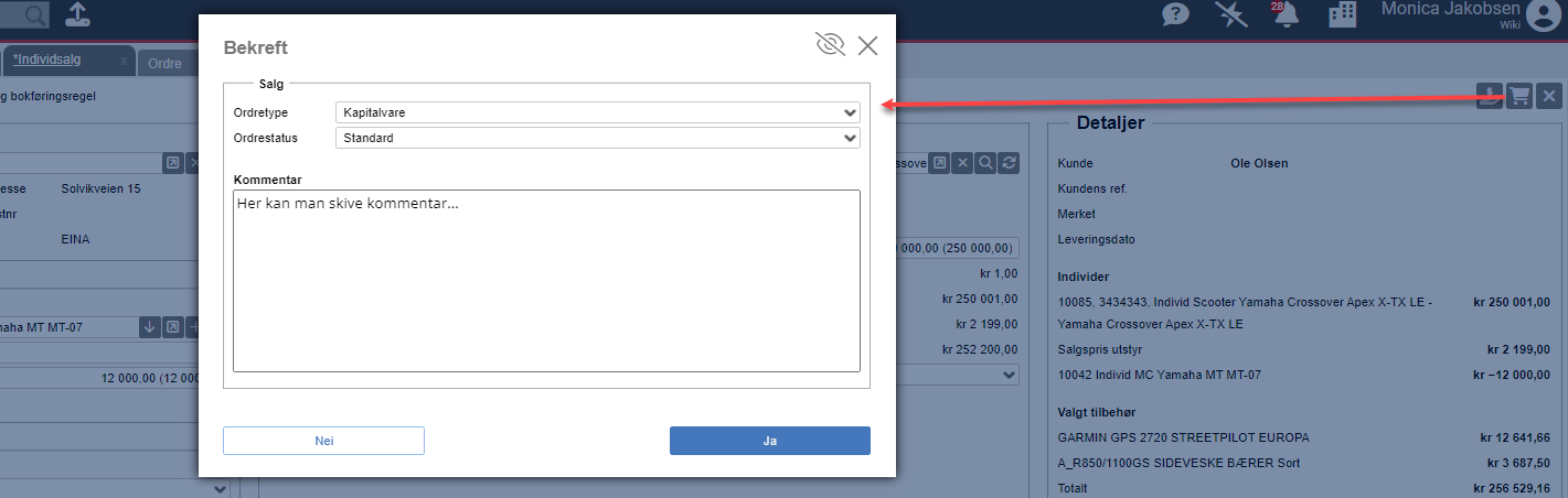Når alle opplysninger om salget er utfylt velger man fra menyen om det skal opprettes som tilbud eller ordre. I dialogboksen som dukker opp velges ønsket ordretype og ordrestatus. Bekreft med å trykke "Ja".