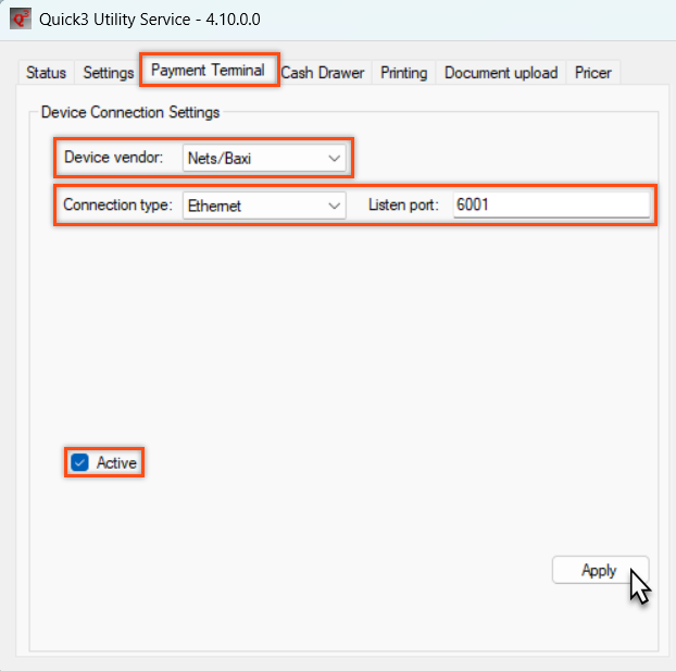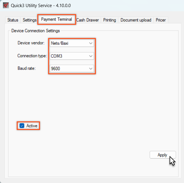 - Huk av for at terminalen er Active, og trykk Apply. Terminalen skal nå kunne knyttes opp mot et kassepunkt i Quick3.