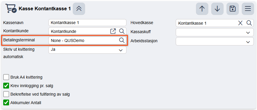 - Denne terminalen blir da tilgjengelig for alle brukere som har tilgang til denne kassen, uansett hvilken PC de jobber fra, forutsatt at PCen hvor QUS kjører er påslått og innlogget. På dette punktet skal terminalen være klar for testing.
