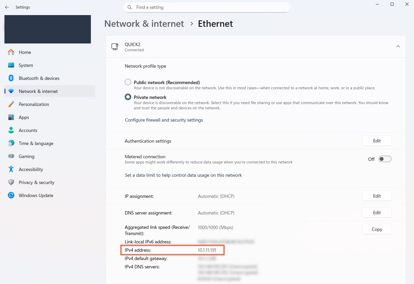 Om terminalen kobles til via nettverk, sjekk at terminalens ECR-innstillinger, da spesifikt IP-adresse, peker til riktig datamaskin. For å kjapt finne IP-adressen til datamaskinen, gå til Windows Innstillinger -> Nettverk og Internett, og trykk på Egenskaper for det nettverket som brukes.
