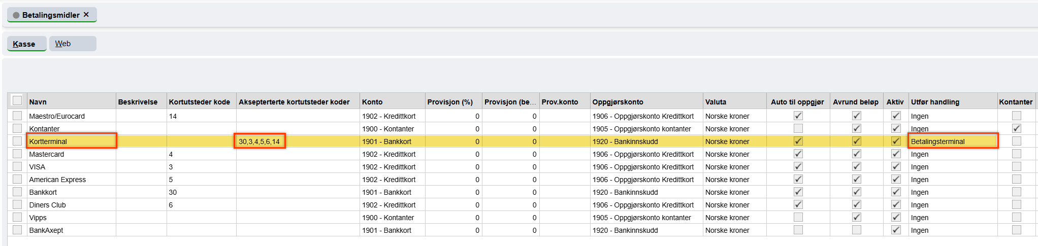 Før vi går videre til funksjonstest er det verdt å sjekke at klientens Betalingsmidler er satt opp til å kunne benytte betalingskort på riktig måte. Veiledningen for å sette opp betalingsmidler i din klient finner du her. Et vanlig oppsett vil se nogenlunde slik ut (klikk på bildet for å gjøre det større):