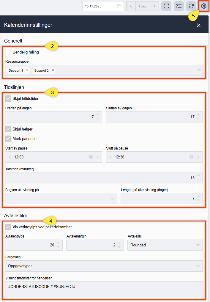 - Seksjonen kalt Avtalestiler handler mest om den visuelle presentasjonen av kalenderen. Her setter man høyden på avtalene, hvilken visuell stil og margin man ønsker, og hvordan avtaler skal fargelegges. Her kan man også sette såkalte Visningsmønster; Hvordan hendelser skal navngis når de er knyttet til en ordre eller en oppgave (mer om dette lenger ned i artikkelen).