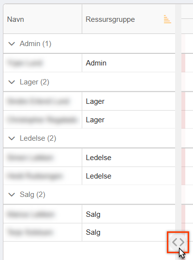 Ressursvisningen kan også kollapses eller utvides om du midlertidig enten trenger mer plass til tidslinjen, eller om du trenger å fokusere mer på ressurser. Hold musepekeren din over høyrekanten på tabellen og knappen for å utvide eller kollapse visningen vil dukke opp.