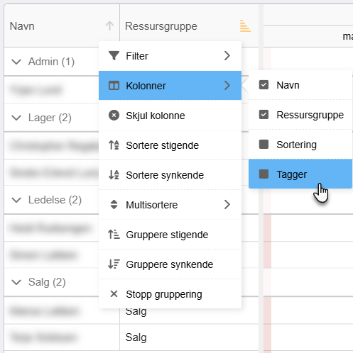 Den nye ressursvisningen kan tilpasses på flere måter for å hjelpe deg med å få full oversikt over alle ansatte og ressursgrupper i din klient. Ved å høyreklikke på tabellhodet vil du få opp en rekke alternativer for filtrering, kolonner, og sortering.
