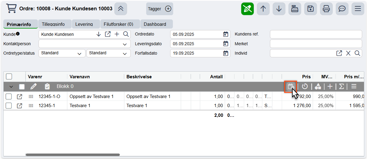 Fra en Ordre kan man trykke på Kalenderknappen i en Blokk for å føre inn en tilknyttet Oppgave, eller ordrelinjer med en satt mengde arbeidstid, til kalenderen.