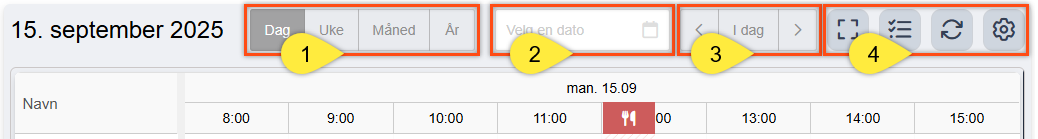For å finne frem i kalenderen og tilpasse tidslinjen har du flere alternativer. Navigeringsmenyen hjelper deg å finne det nøyaktige tidspunktet du trenger, raskt.