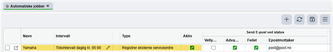 For at Quick3 skal kunne holde integrasjonen mot Yamaha oppdatert med nye jobber, servicer, tilbud osv., må det opprettes en automatisk jobb av typen "Registrer eksterne serviceordre". Vi anbefaler at denne kjøres daglig.