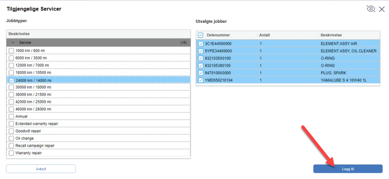 Du kan klikke på denne knappen for å hente tilgjengelige servicejobber utifra det aktuelle individets VIN (rammenummer) eller motornummer som er knyttet til blokken. Et nytt bilde som inneholder tilgjengelig jobber vil komme opp hvor du kan velge ønsket jobb med tilhørende varer. Trykk til slutt på "Legg til"-knappen for å legge til alle varelinjer på blokken.
