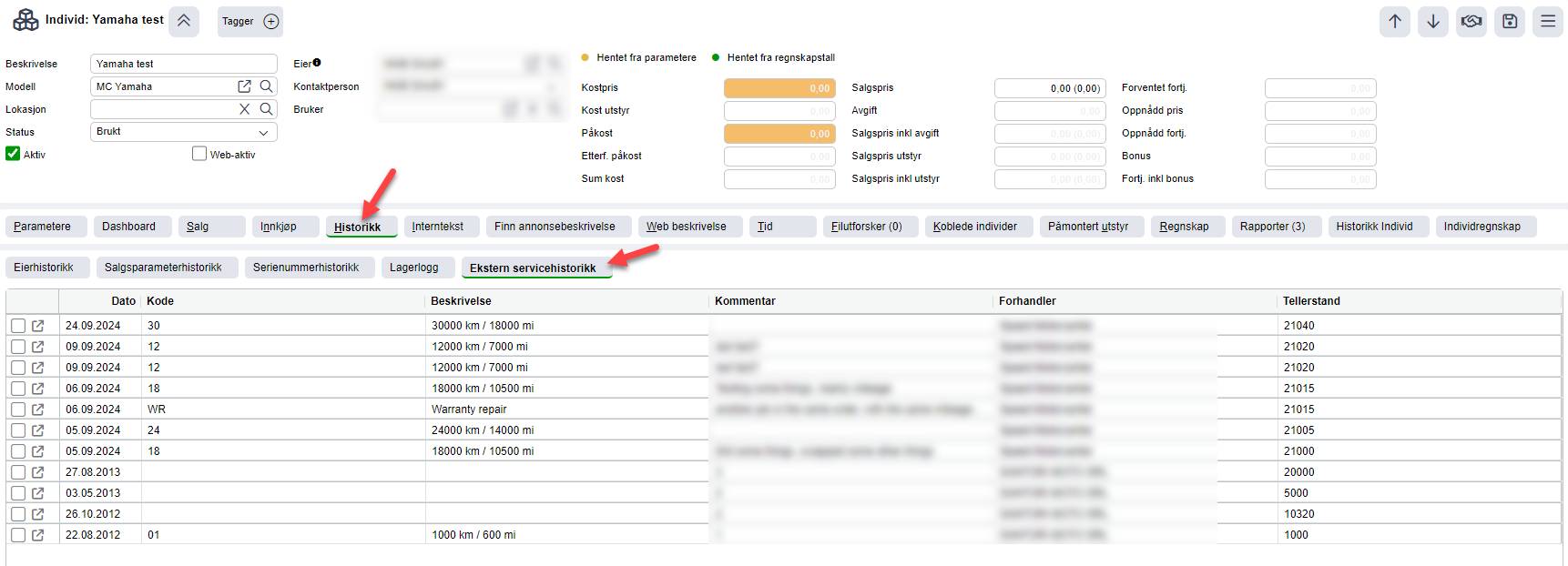 Tidligere registrert servicehistorikk hos eksterne Yamaha-forhandlere er tilgjengelig på Individkortet under Historikk > Ekstern Servicehistorikk. Her kan man se hvilke jobber som er utført, når de ble utført, og hos hvilket verksted.