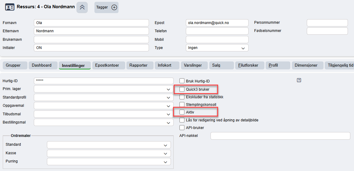 Selve prosessen for å deaktivere en ressurs er enkel; Åpne brukerens ressurskort via ressurssøket (⌨️Alt+R). Åpne fanen Innstillinger, og fjern hukingen for "Quick3 bruker" og "Aktiv". Husk å lagre (⌨️Ctrl+S) for å iverksette endringen.