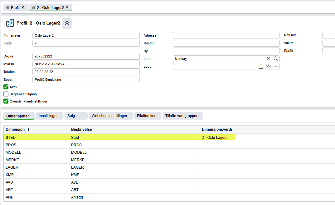 For å få regnskap på profilnivå må profilene knyttes til hver sin dimensjon for Sted. Selve dimensjonene opprettes under Dimensjoner. Merk at dette må gjøres for alle profiler det skal rapporteres for, både hovedprofil og de andre.