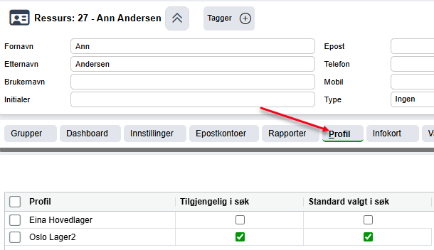 De profilene ressursen skal ha tilgang til angis under fanen Profil.