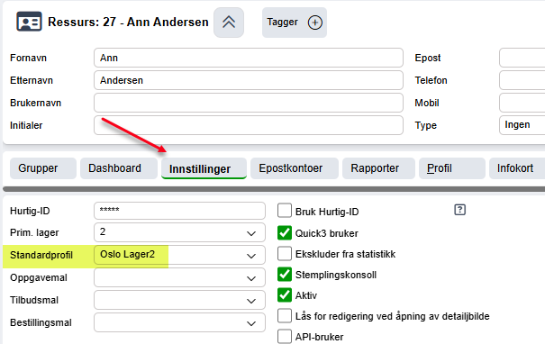 Videre knyttes ressursen til en Standardprofil, under fanen Innstillinger. Ved innlogging vil profil følge ressursen.