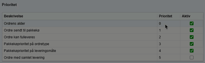 Denne tabellen har et sett med regler som du kan aktivere, deaktivere, og sortere etter behov. De aktive reglene, basert på deres prioritet, sorterer ordre i pakkekøen slik at de med høyest prioritet havner øverst i listen, og dermed plukkes i den nødvendige rekkefølgen.