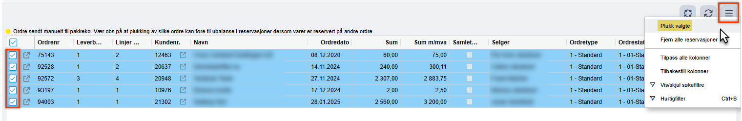 Man kan også plukke/skrive ut flere ordre av gangen (inntil 9 stk) ved å huke disse i tabellen, åpne hamburgermenyen og velge "Plukk valgte".