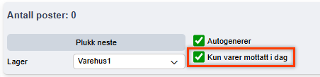 Dette enkle alternativet i pakkekøen vil endre visningen til å kun vise ordre/ordrelinjer med varer som er registrert mottatt inneværende dag. Prioritering og filtrering slik det er satt i Klientinnstillinger vil fortsatt gjelde.