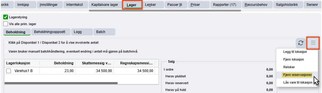Eller så kan man gå til de individuelle varenes varekort gjennom varesøket (⌨️Alt+V), og finn fanen "Lager". Deretter, trykk på hamburgermenyen til høyre, og velg "Fjern reservasjoner". Nye ordre som inneholder denne varen vil da kunne reservere antallet igjen, og behandles i pakkekøen som normalt.