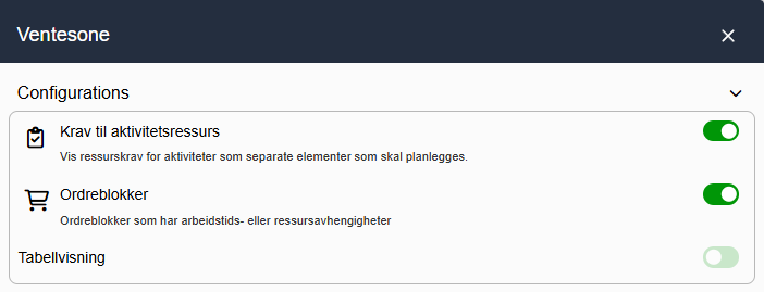 For at en ordre skal dukke opp i Ventesonen må ordren ha minst én ordrelinje med en vare som inneholder en satt arbeidstid, eller ha et eget ressursbehov satt under ordrens Ressursbehov-fane. Om ordren har begge deler vil den vises dobbelt opp i Ventesonen ettersom disse to ressursbehovene kommer fra forskjellige kilder.