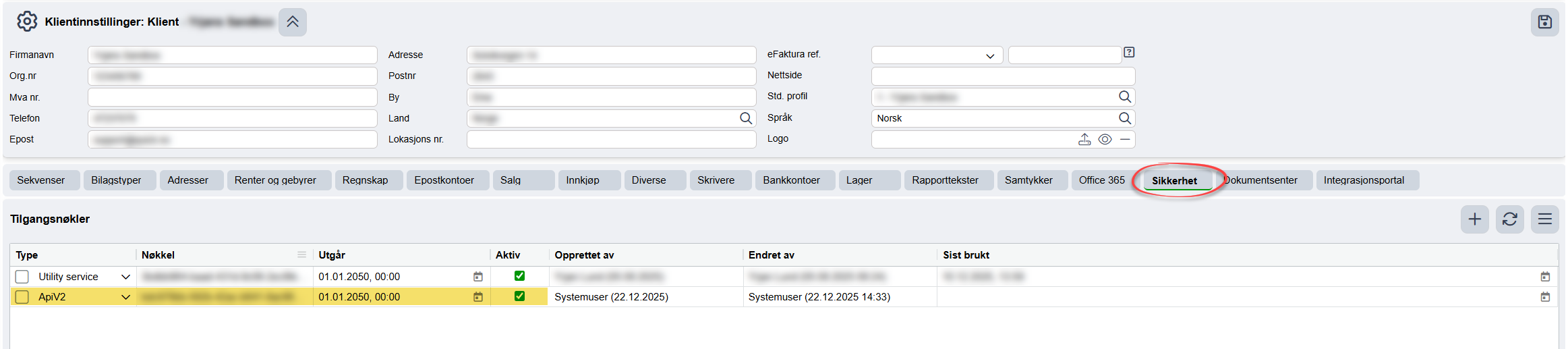 Klikk på brukerikonet ditt øverst til høyre i Quick3, og finn menyvalget "Klientinnstillinger". Åpne deretter fanen kalt "Sikkerhet". Om din klient ikke allerede har en tilgangsnøkkel for "ApiV2", opprett en ny rad med plusstegnet, og gi den riktig type.