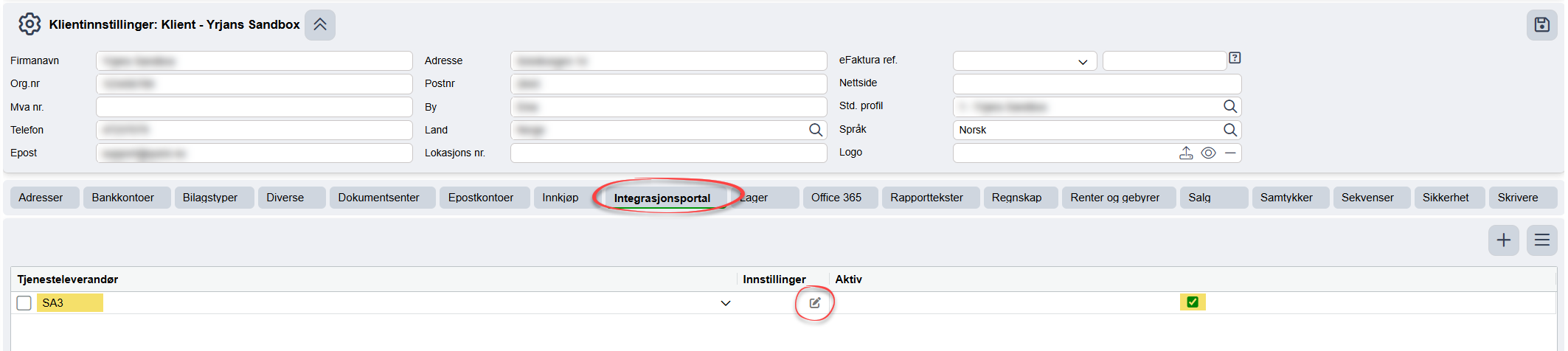 Finn fanen "Integrasjonsportal". Trykk på plusstegnet for å legge til en ny integrasjon, og velg "SA3" som tjenesteleverandør. I kolonnen "Innstillinger", klikk på redigeringsknappen.