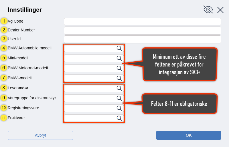 Dette feltet skal fylles inn med samme forhandlernummer som bedriften bruker for å logge inn i SA3+ programmet. - User ID