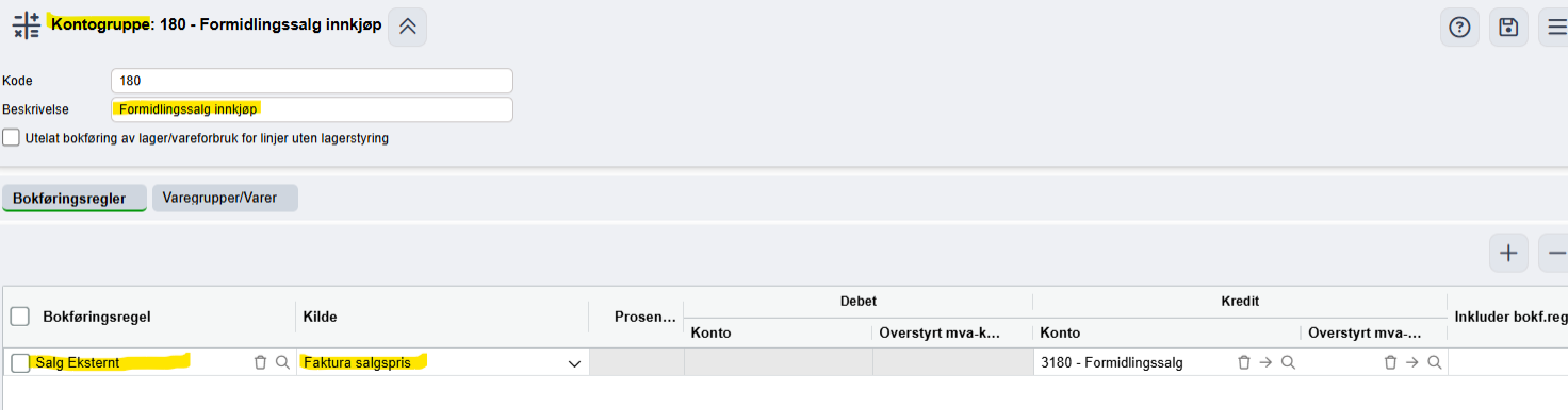 Opprett en kontogruppe for "Formidlingssalg Innkjøp" (for innkjøp av individ som skal selges videre). Sett bokføringsregel til "Salg Eksternt", og i vårt eksempel har vi opprettet konto "3180 Formidlingssalg", som vi har lagt inn.
