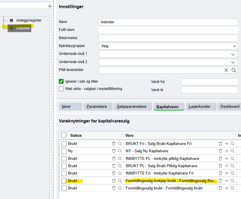 Opprett en vare kalt "Formidlingssalg Innkjøp Brukt", og knytt denne mot varegruppe "Formidlingssalg Innkjøp". Dette varenummeret må også legges inn i merke/modellregisteret på hovednoden og det må settes en hake for innbytte.