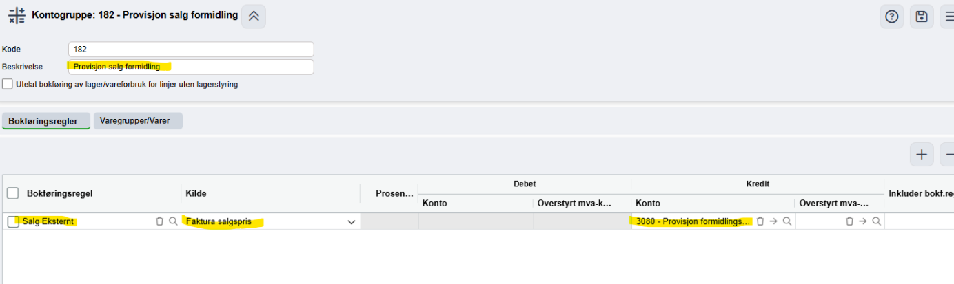Så må det opprettes en kontogruppe for "Provisjon Salg Formidling". Denne inntekten er MVA-pliktig og vi har valgt å opprette en egen inntektskonto med MVA-kode 3: