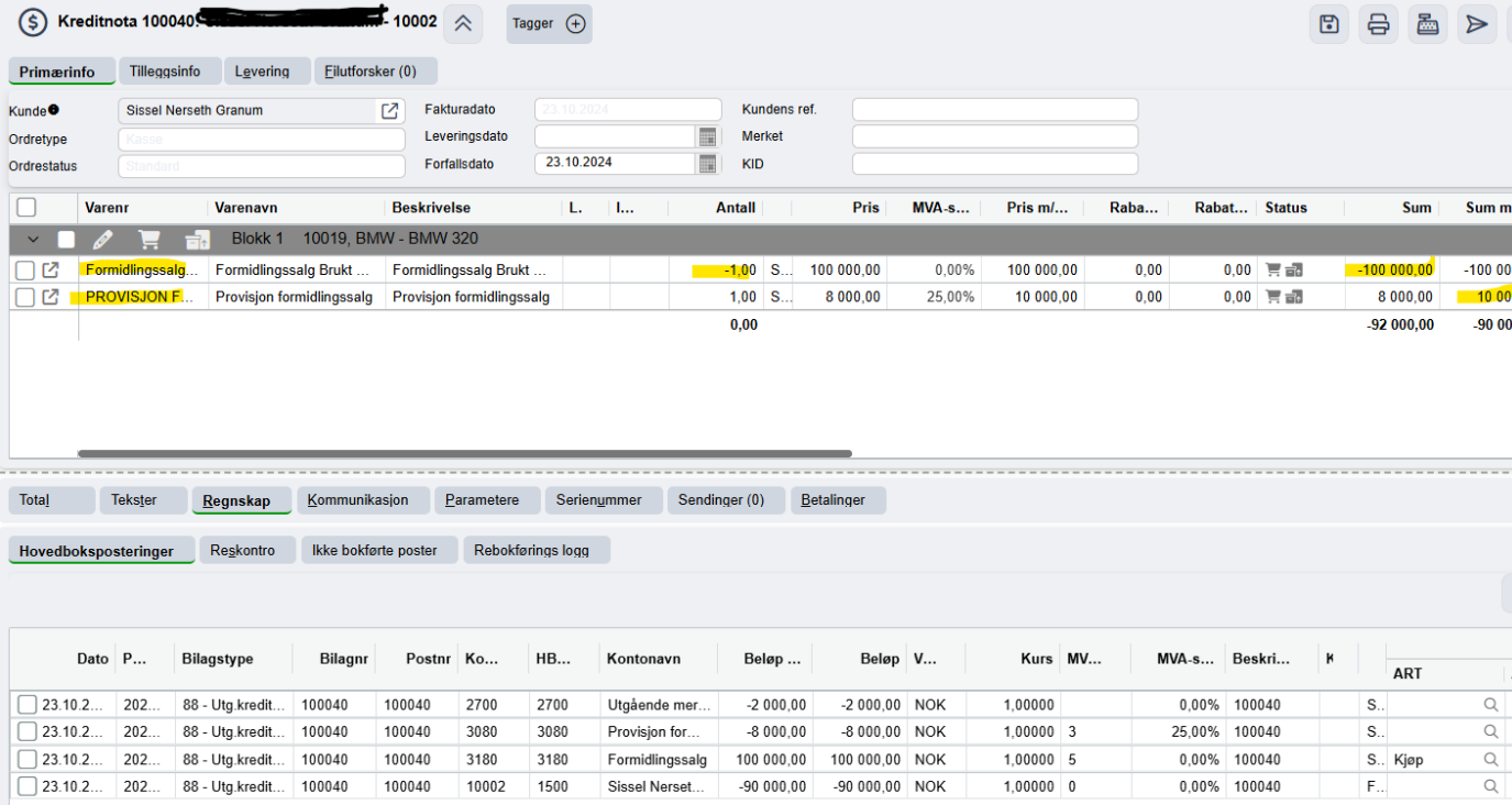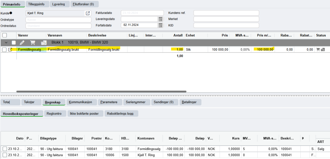 I regnskapet er kjøp- og salgssummen ført debet/kredit, her på konto 3180. Provisjon er inntektsført, og MVA er avsatt.
