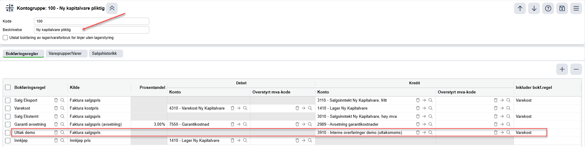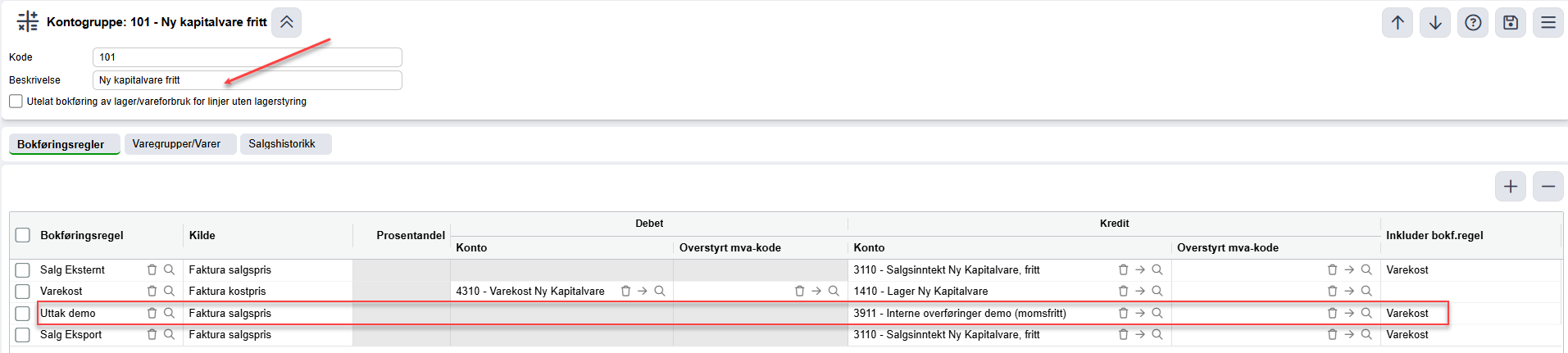 - Må ha egen varegruppe og kontogruppe for nytt kjøretøy fritt, legg til bokføringsregel Uttak demo med Konto: 3911 Interne overføringer demo (mva‑fritt), mvakode 5, 0%.