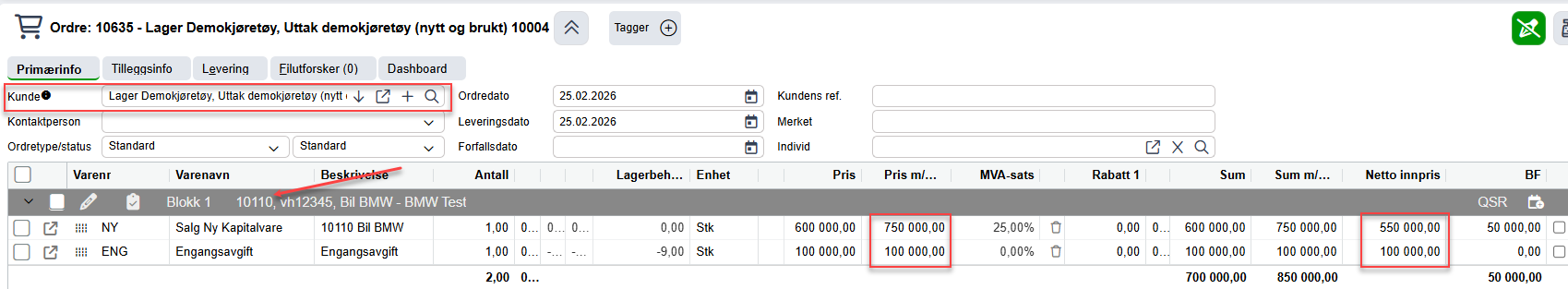 - Kunde: Lager Demo, som vil bli eier av kjøretøyet etter fakturering.