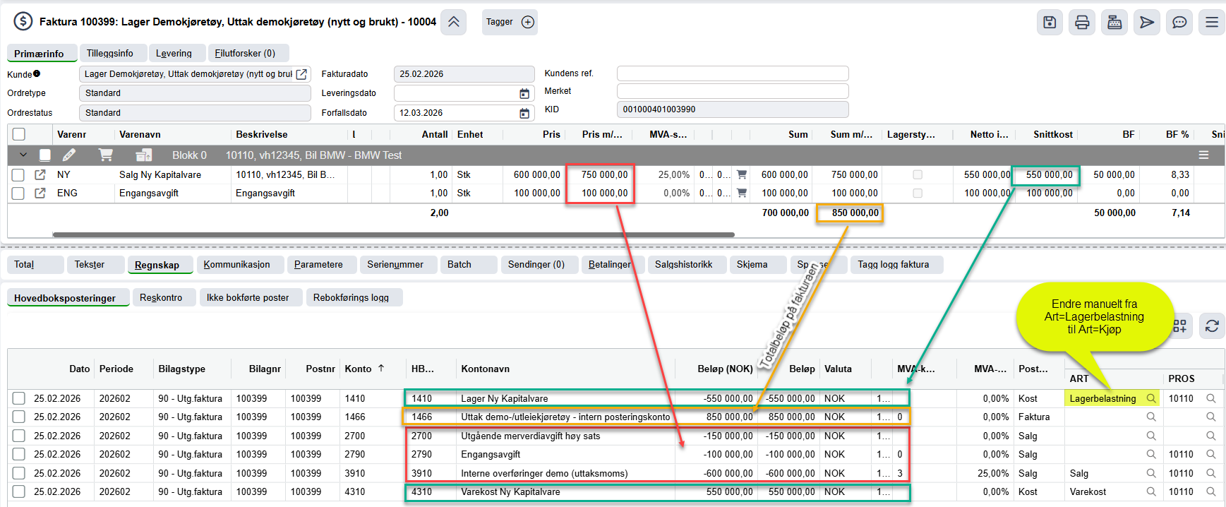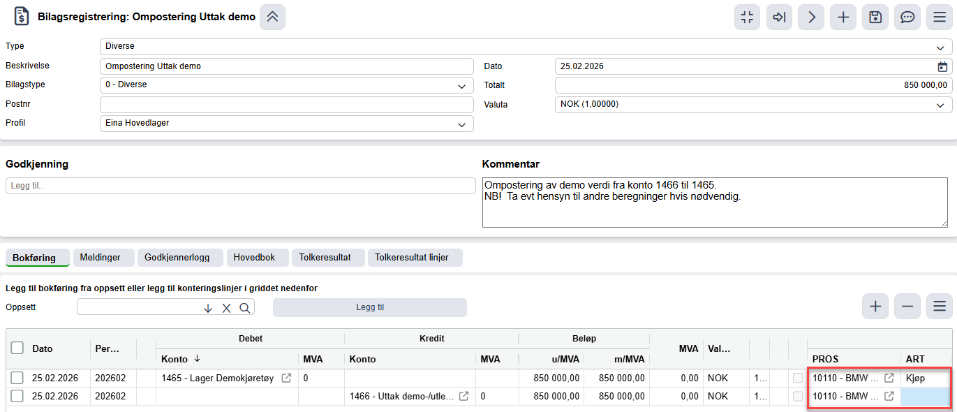 Ikke alt går helt automatisk. Du må derfor manuelt inn på fakturaen for 'Uttak demo' og endre art på posteringen som automatisk har fått Lagerbelastning. Denne skal ha Art=Kjøp. Grunnen til dette er at den posteringen må utligne kostprisen fra den opprinnelige inng. fakturaen for innkjøpet av bilen, siden dette ligger med samme prosjektnr.