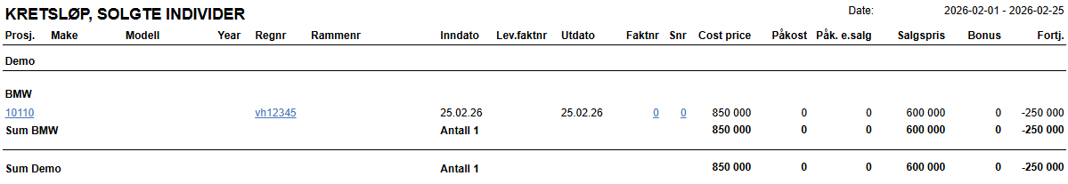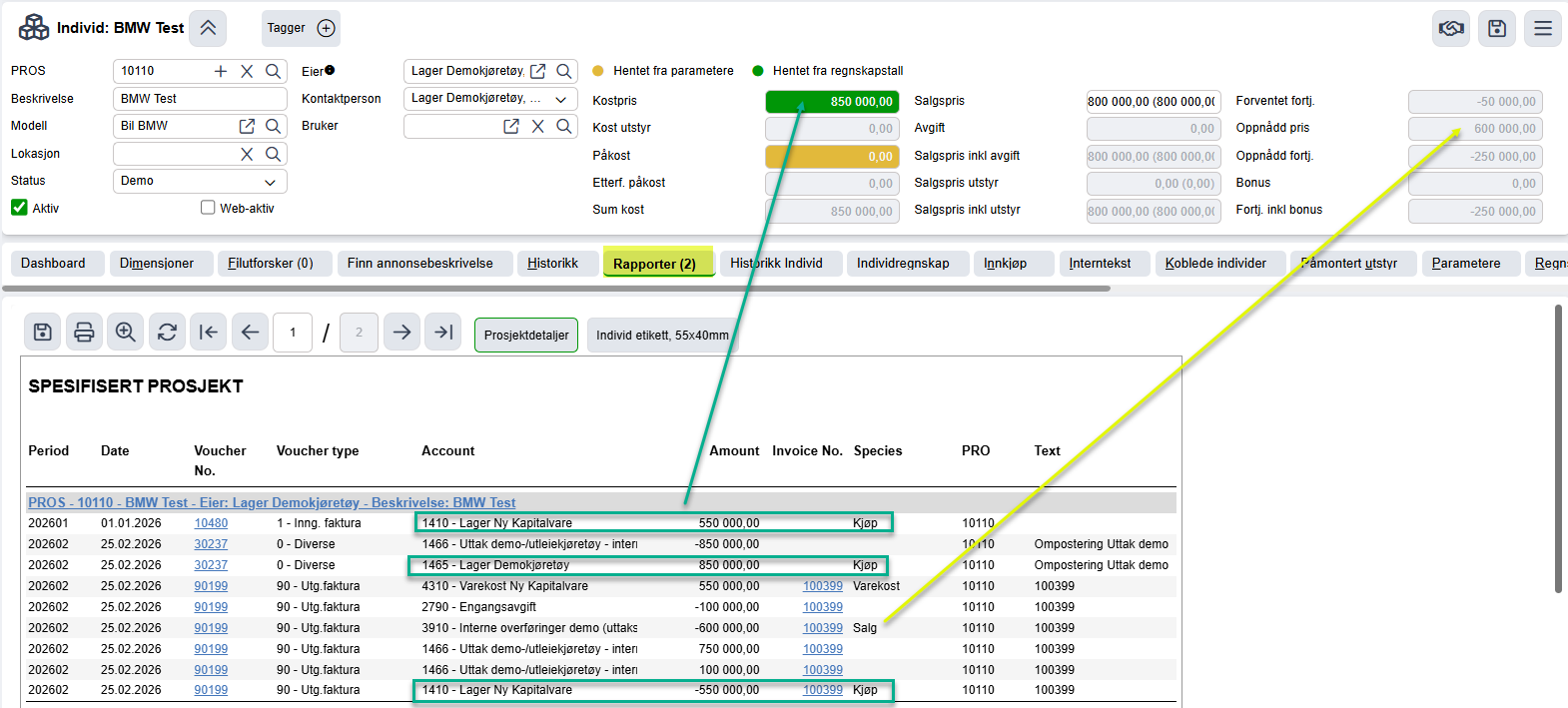 Hvis det gjøres påkostninger på individet på et senere tidspkt, dvs etter at det er tatt i bruk som Demo individ, skal dette internfaktureres til egen kunde som er tiltenkt dette. Eks Service/Påkostninger Demokjøretøy som settes opp med korrekt kostnadskonto for fakturering av service mm, feks kto 75xx eller intern motkonto 39xx.