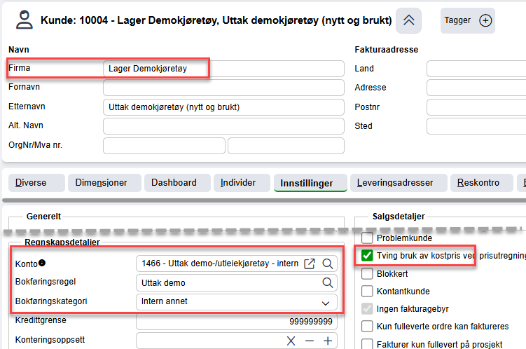 Internkund Lager Demo brukes alltid for fakturering av uttak demo.