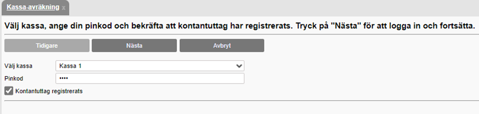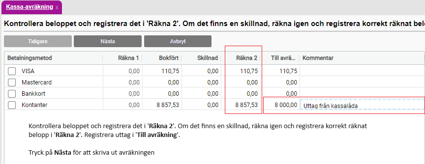 Exempel: Om ni har totalt 8 857kr i kassan och vill ha en växelkassa på 857 kr, Ange det belopp som ska tas ut från kassan som då är 8000:- vilket då ger 857:- kvar som växelkassa.