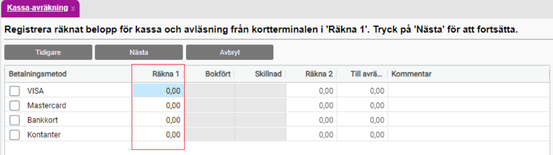 - Ange dom räknade betalningsmetoderna för dagen i kolumnen Räkning 1