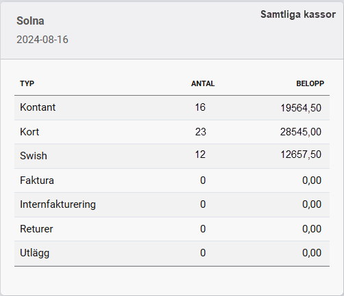 Här ser ni alla dom olika betalsätten som har använts vid försäljning i ert kassasystem.