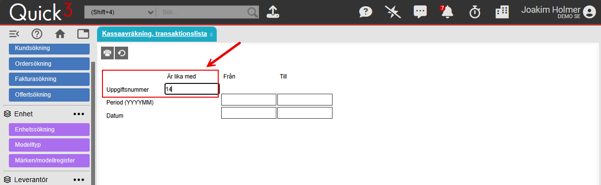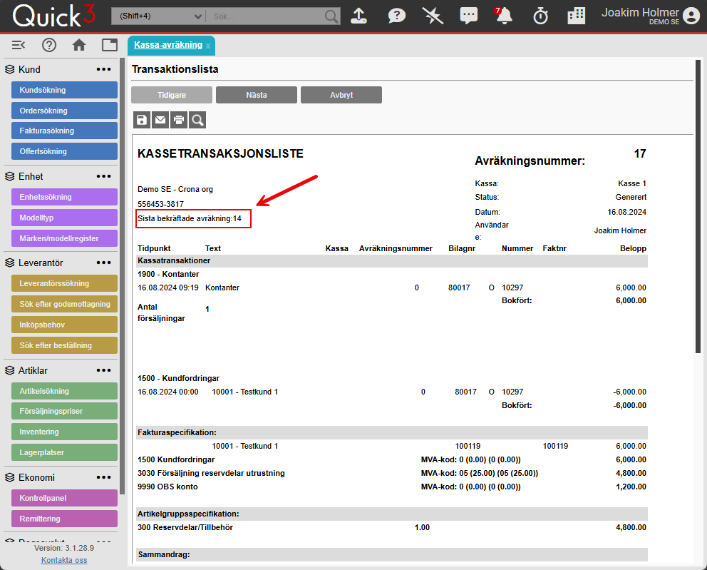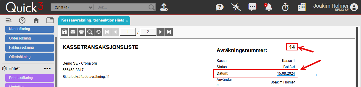 Öppna sedan rapporten Kassaavräkning, Transaktionslista och fyll i numret för den senaste avräkningen